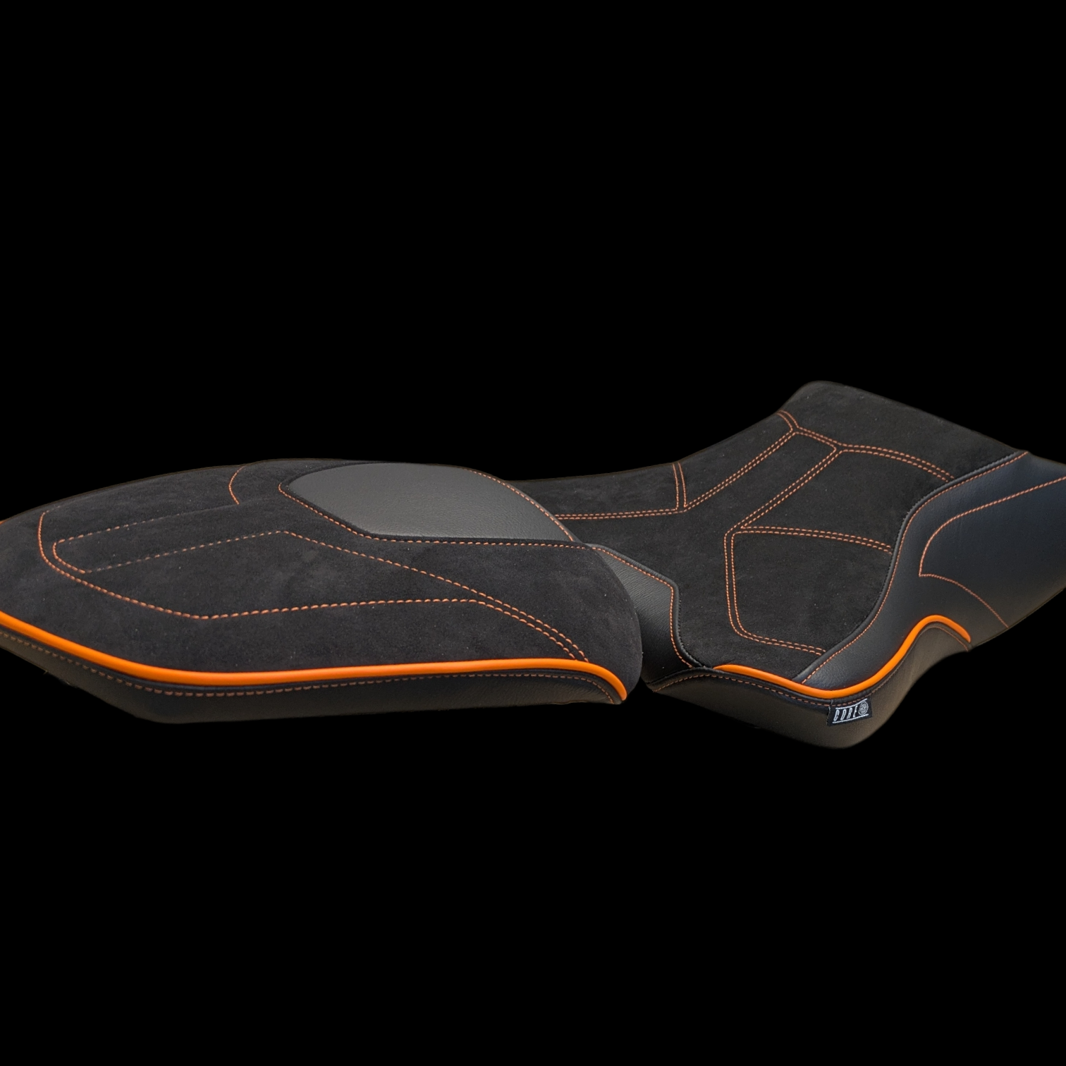Black grain leather side panel detail with Alcantara seat panels, Orange CORE panel pattern, orange piping and KTM logo